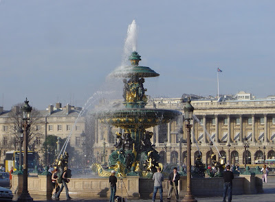 =>Place de la Concorde (8th arrondissement, right bank) is at the foot of the Champs-Élysées, built as the "Place Louis XV", site of the infamous guillotine. The Egyptian obelisk is Paris' "oldest monument". On this place, on either side of the Rue Royale, there are two identical stone buildings: The eastern one houses the French Naval Ministry, the western the luxurious Hôtel de Crillon. Nearby Place Vendôme is famous for its fashionable and deluxe hotels (Hotel Ritz and Hôtel de Vendôme) and its jewellers. Many famous fashion designers have had their salons in the square.